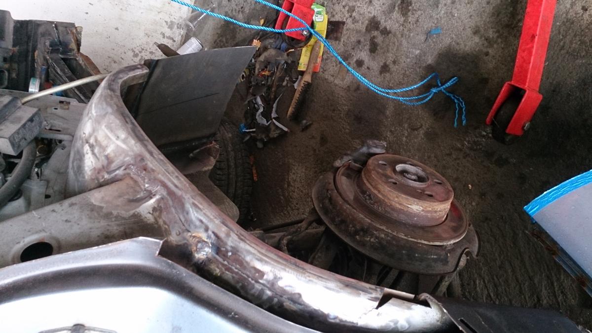 Gjort ferdig ene sida i dag. Montert ny bremslange, nye bremseklosser og fått sammen alle delene. Justerte forstillinga slik noen lunde, men blir påkostet firhjulskontroll etter at høresiden er ferdig, samt at jobben på bakstillinga og under bilen blir ferdig