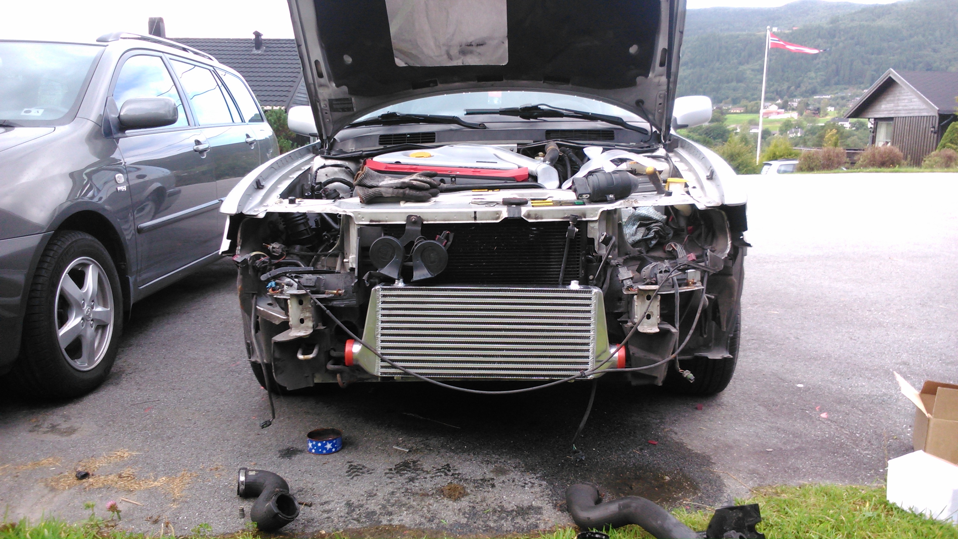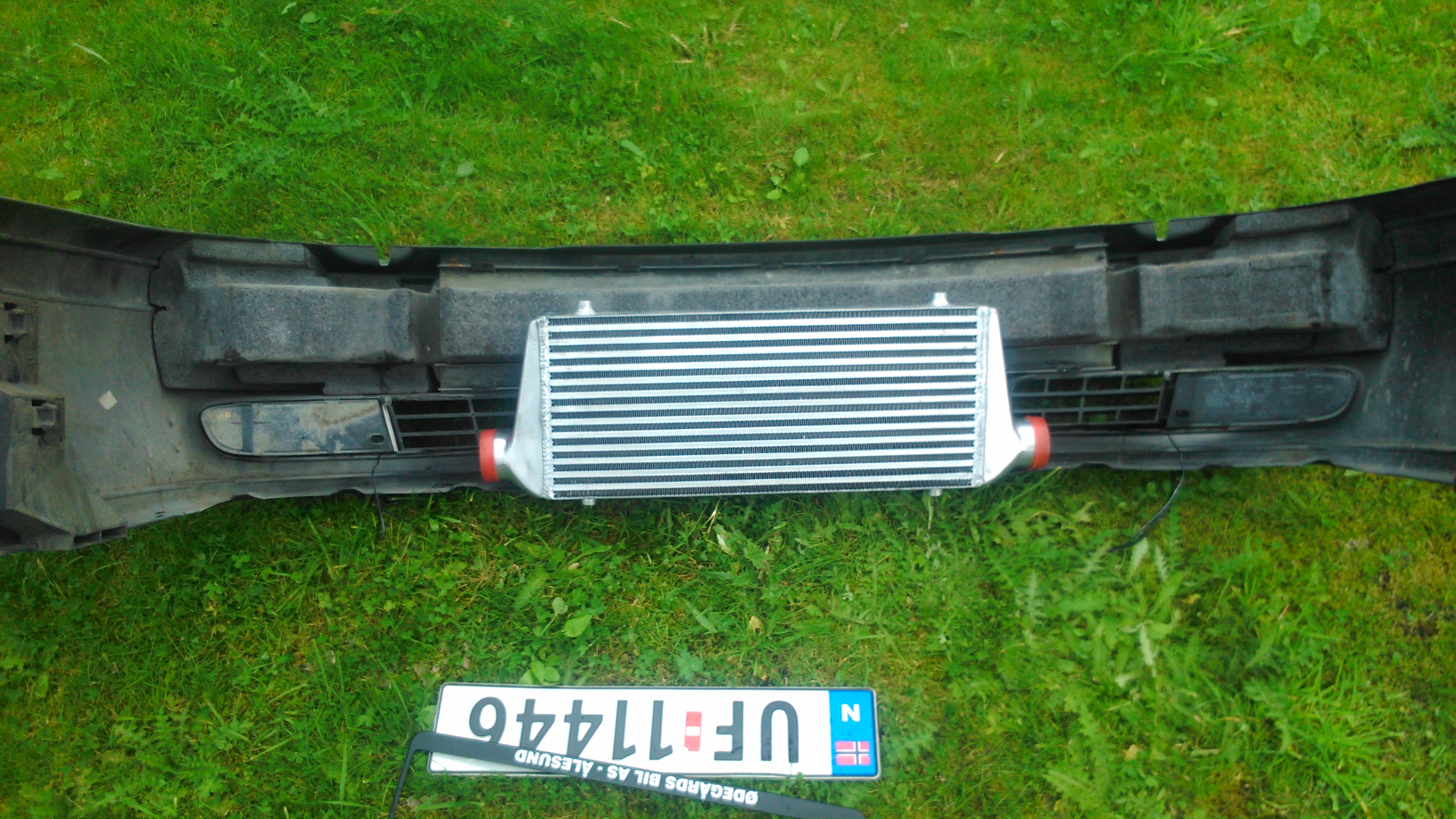 Har vært ute og skrudd litt mer, skjærte ut av fangeren for og få mer plass for intercooleren og lagde nye fester til den plasseringen er veldig bra
