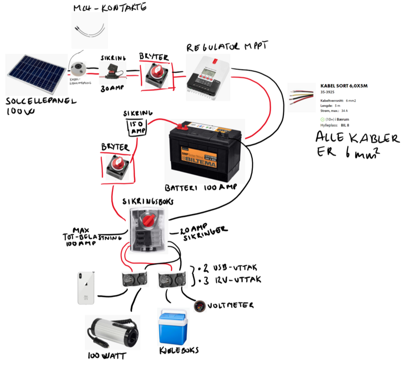 Jeg har kjøpt meg en Opel Vivaro som jeg bygger om til en camper-van. Jeg har i utgangspunktet hverken peiling på bil eller elektronikk, men har etter noen måneder med fikling, bygging, googling og youtubing opparbeidet meg en større praktisk sans (takk gud) og en viss forståelse for hva som er opp og ned på bilen. Og det jeg har forstått er at når det gjelder elektronikk så skal en få noen med litt mer peiling til å se på det. Så da gjør jeg det, jeg spør dere forummedlemmer hva dere tror om dette elektriske skjemaet? Er det noe jeg kan montere i bilen? Målet er å få opp en uavhengig strømkilde hvor jeg kan få ladet mobil og PC, kanskje koble til en svak varmevifte og en kjøleboks. Jeg er mest interessert i om dette ser ut som et trygt oppsett, mtp. belastning, korrekt tykkelse på kabler og antall sikringer. Jeg har ikke finregnet på strømforbruk og behov for strømforsyning. Det aner meg at jeg kanskje trenger flere solcellepanel dersom jeg skal ha komfortabel tilgang til strøm, men enn så lenge holder det at jeg får etablert en strømkilde i bilen. Har ikke råd til å svi av 10k på solcellepanel og batteri i første omgang heller. Alle kommentarer, uansett hva det er på, tas i mot med stor takk. Kanskje er det noen andre som kan få bruk for arbeidet mitt også?