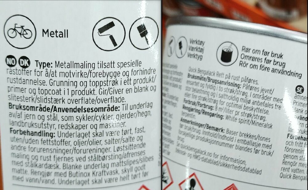 Lurer litt på dette. Noen tipset meg en gang i tiden, om at Arcanol rusthindrende grunning var bra også på bil. Bil er ikke nevnt på boksene, men metall, sykler osv. Er det noe i veien for å bruke det på bil, noe som gjør at det bør frarådes? Her er det snakk om litt eldre bil, og ikke så nøye synsmessig. Og så er der bengalack som tilsvarer omtrent bilens farge. Tenker at det kan være hendig å bruke, og holdbart? Hva med den grunningen som heter "rett på rust"? (se bilder). Der er tre sorter. hvit, sort og base blank. Hva er motargumenter mot å bruke slik på bil, noen synspunkter?