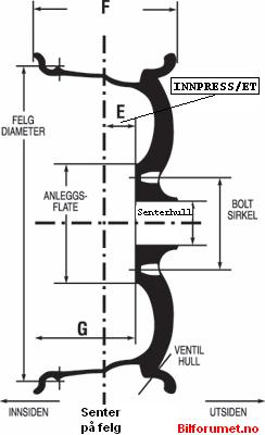 Originalt er vel ET38, du kan da avvike maks 15mm fra dette, altså inntil 7,5mm per side. Du kan selvsagt ha annen diameter på felg, men rulleomkretsen på dekket må ikke avvike mer enn 5% fra originalt.