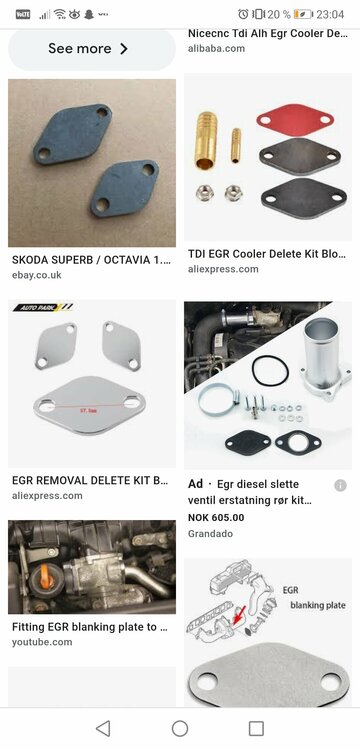 Hei Nylig fått feilmelding på bilen og viser seg at det er EGR'n som er problemet (daukjørt 170 000km) Bilen har nylig blitt godkjent og har planer om å kun beholde bilen frem til neste EU kontroll om ca 2 år. Fikk tilbud fra verksted på bytte av EGR ventilen på 12 000,-, men merker at lysta på å betale 12 000 kr for og bytte den ventilen skjer ikke, da blir det ny bil. Har googlet litt og ser at man kan kjøpe en blokkeringsplate som blokkerer røret som går til ventilen. Kan dette fungere for og holde bilen kjørende i 1-2 år til? Evnt andre rimeligere alternativer som gjør at jeg kan ha bilen litt til? Betaler ikke flere 1000 kr for bytte av ventilen da bilen er gammel og fare for at andre dyre reparasjoner kan forekomme. Da er det billigere og kjøpe ny bil. VW passat 2011-2015 mod.