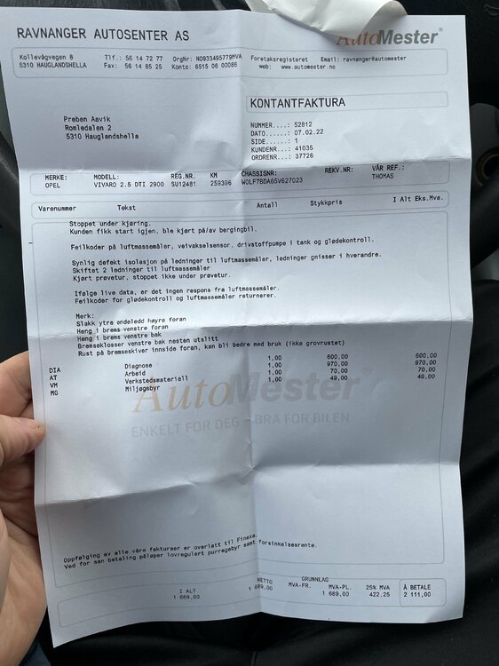 Hei. Har en Opel vivaro fra 2005 som har rullet 260.000km. bilen sto parkert ute i 2 uker, når jeg igjen skule bruke bilen så startet den og gikk helt fint i ca 20 min. plutselig dør motoren helt ut av det blå under kjøring. etter noen min får jeg start på den igjen og den kjører et par hundre meter før det samme skjedde igjen.. ble hentet av falcken som tok bilen til nærmeste verksted, verkstedet tok de diagnose test av bilen og fant følgende feil: Luftmassemåler (ingen respons) Veivakselsensor drivstoffpumpe i tanken. det ble kun byttet noen dårlige ledninger i forbindelse med luftmassemåler, feilkoder forsvinner ikke. verkstedet testkjører bilen på veienog den fungerer da OK. når jeg får tilbake bilen så bruker jeg den problemfritt i ca en uke, (men den ble kun brukt til relativt korte turer) frem til i dag.. motoren hadde vært i gang i ca en time når den plutselig stopper igjen under kjøring.. rett før den stoppet kunne jeg skimte «stopp» og «batteri symbolet» flimret litt.. når jeg omsider får startet bilen igjen går det fint å gasse mens bilen står i fri, men når jeg slipper clutchen og skal begynne å kjøre så dør den.. altså med en gang den får motstand.. virker som om bilen kan kjøre når temperaturen på motoren går ned? Noen som har en formening om hva som bør gjøres??